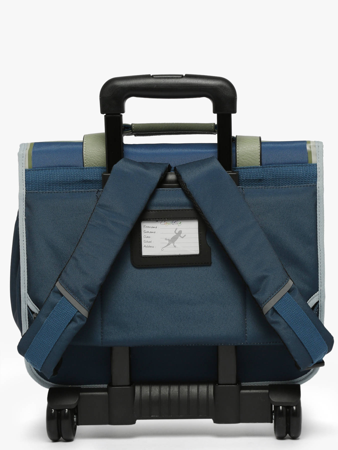 38 cm - 15 litres - 2.33 kg ~ Cartable à roulettes enfant 38 cm de la ligne Vintage Urban signé Caméléon. Idéal pour le CP, CE1 et CE2. Composé de 2 compartiments séparés par une poche centrale zippée, ce cartable enfant est pensé pour ranger toutes les affaires scolaires. Il peut contenir du format cahiers A4. Pratique, l'intérieur se compose d'un emplacement spécial règle. A l'extérieur il y a un emplacement pour la gourde. Les poches extérieures zippées sont idéales pour ranger les petits effets comme l'agenda ou le goûter. Pour faire rouler le cartable, les bretelles doivent être rangées dans la poche au dos. A la fois renforcé et rembourré, ce cartable assure confort et résistance. Côté sécurité, il dispose de bandes réfléchissantes sur le devant et sur les bretelles du cartable. Fabriqué en polyester recyclé imperméable. Petit plus, la règle est offerte !